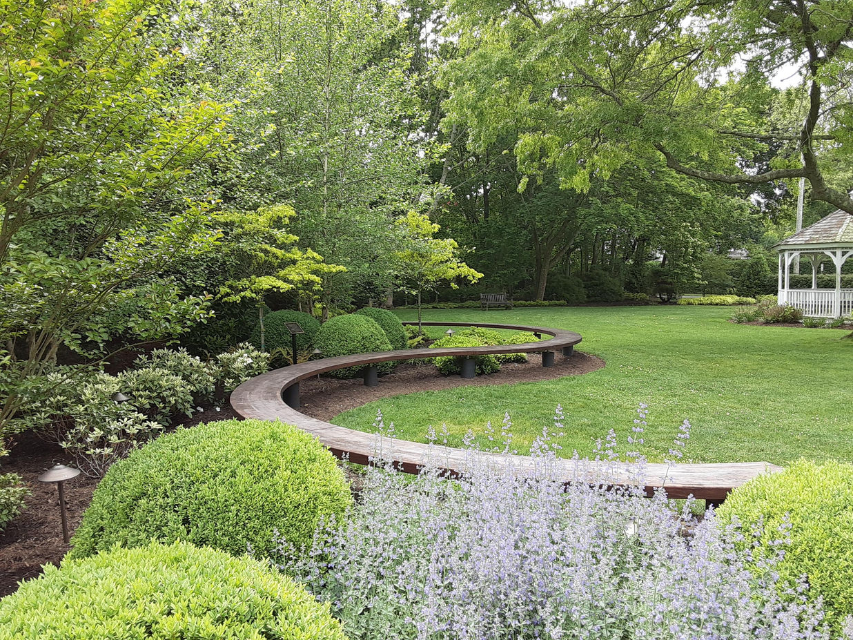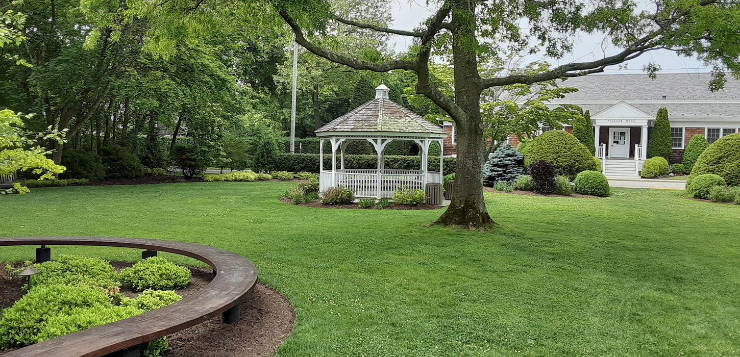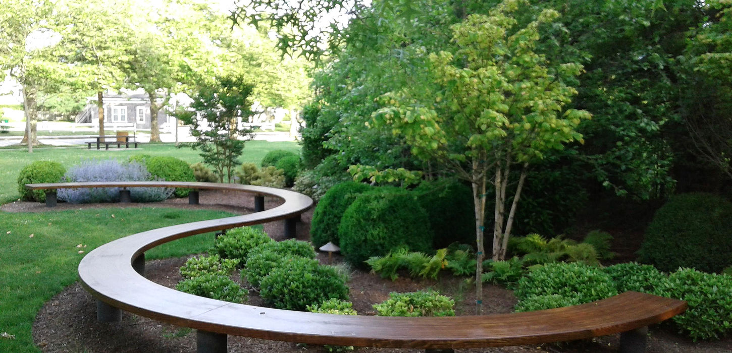 Quogue Village's park that was renovated to create open space, improve border plantings, connect with THE Village office, provide a place to sit with a custom curved bench, and provide picnic tables opposite the popular Quogue Market in the center of the village.