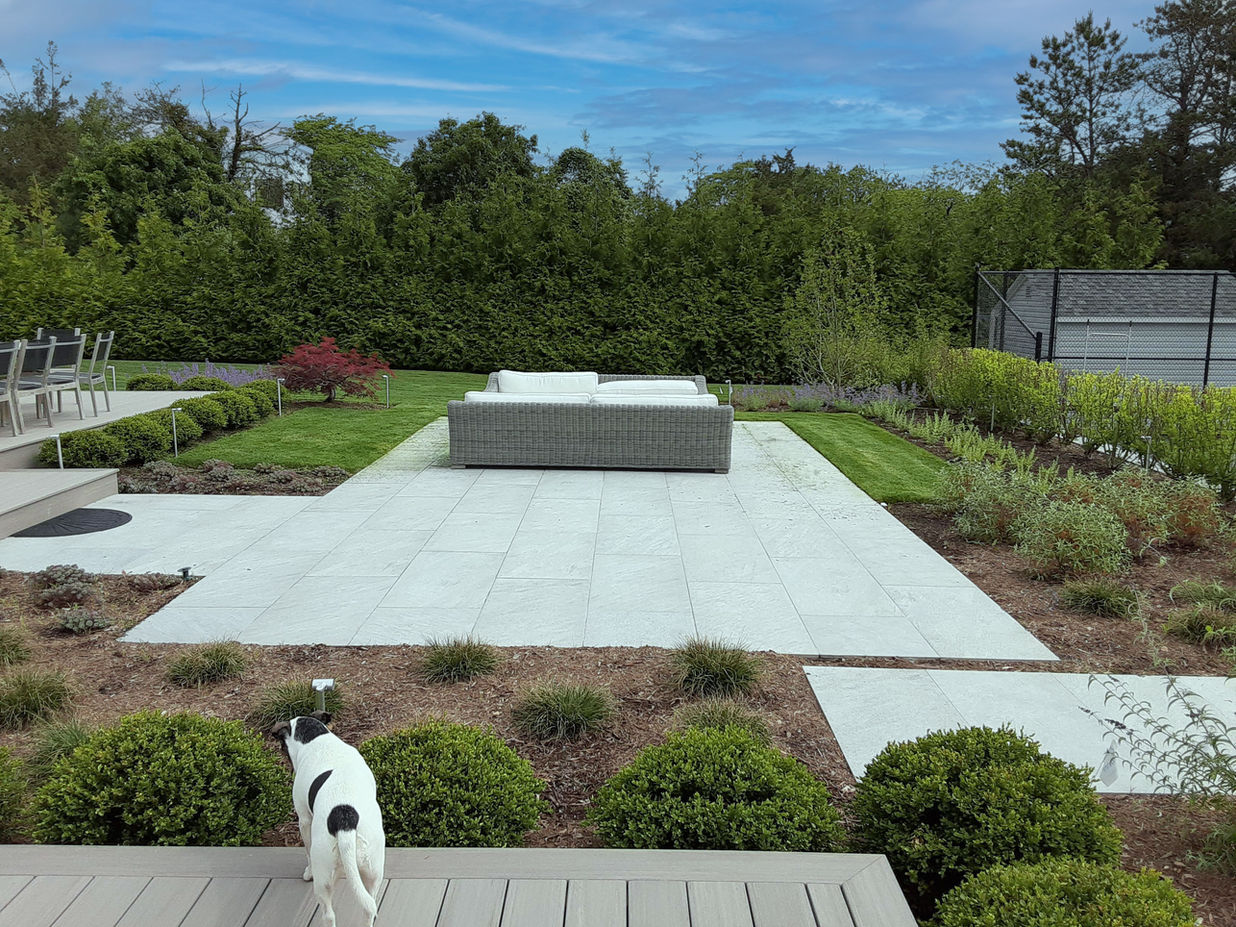 The client's garden was having issues with drainage and so we implemented drainage measures. We also designed and oversaw new retaining walls, steps, patios, railings, BBQ area and foundation plantings.