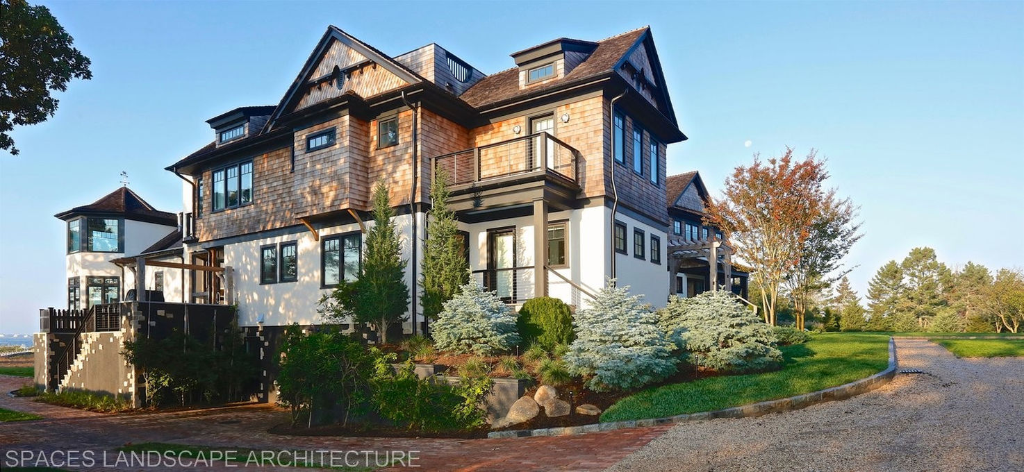 A home overlooking the bay with beautiful sunsets, required patios, pools and fire pits to enjoy them. For the front of the house we selected specimen trees and added lighting to the landscape.
